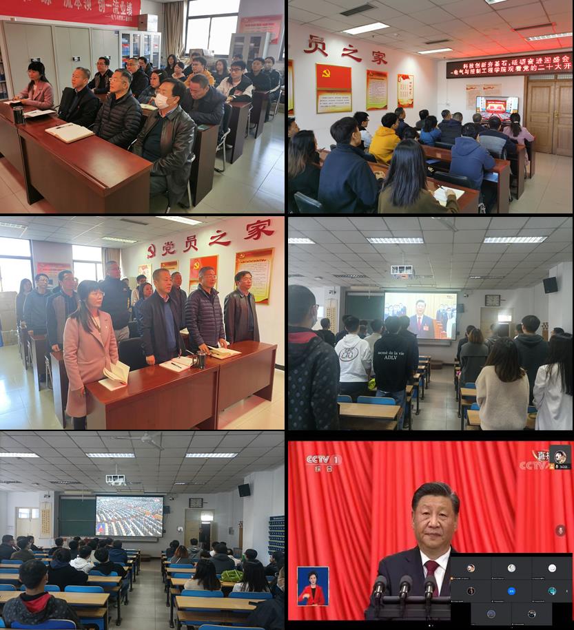 院党委书记赵正杰带领学院党委委员、院领导、科级以上干部、各党支部书记及研究生党员代表在主楼621党员之家集中观看,直播过程中,大家犹如置身大会现场,全体起立唱国歌,为革命先烈默哀,认真聆听记录习近平总书记报告精神,并仔细记录报告有关内容,第一时间学习领会会议精神。