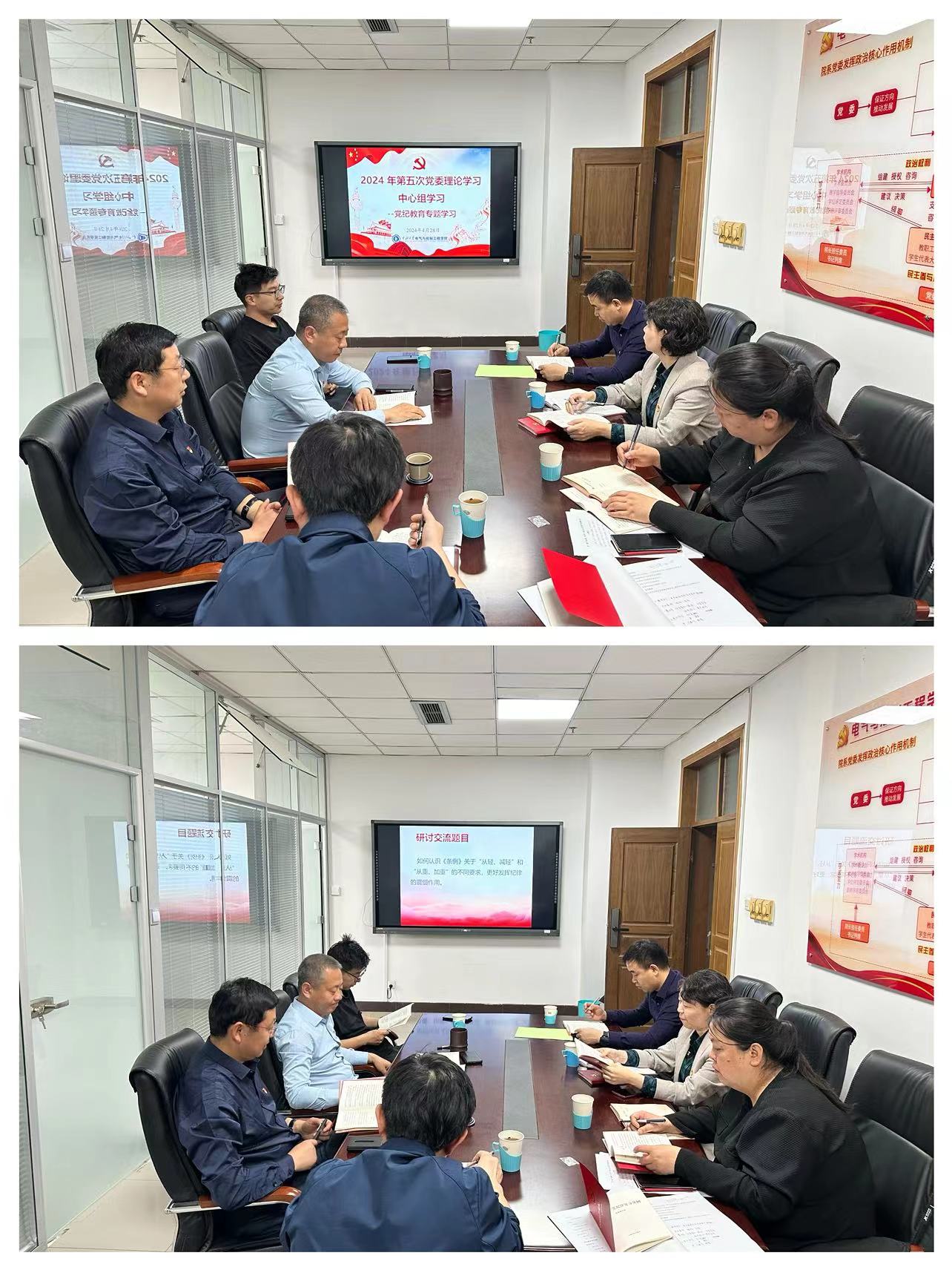 党委理论学习中心组开展2024年第五次学习,即党纪专题教育四月第一次学习,全体党委理论学习中心组成员参会,学院党委书记赵正杰主持会议。