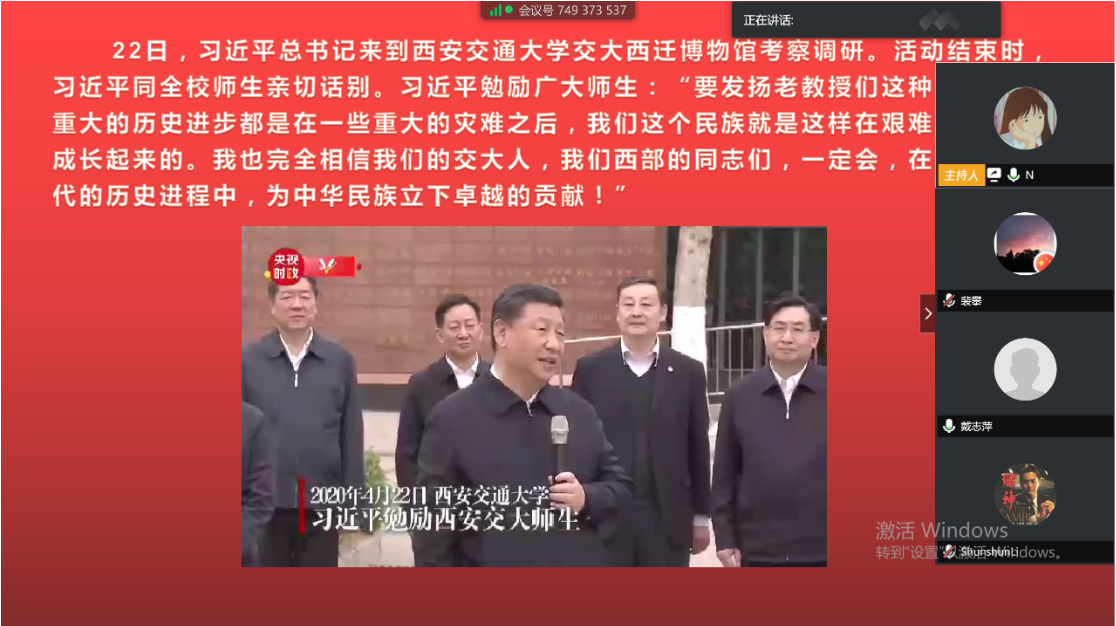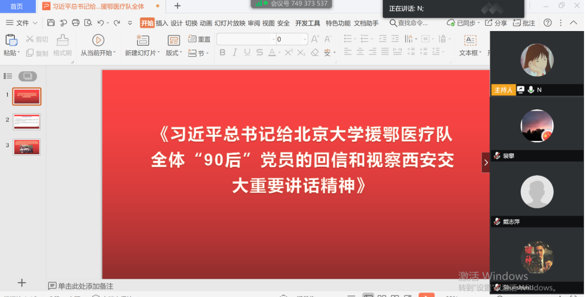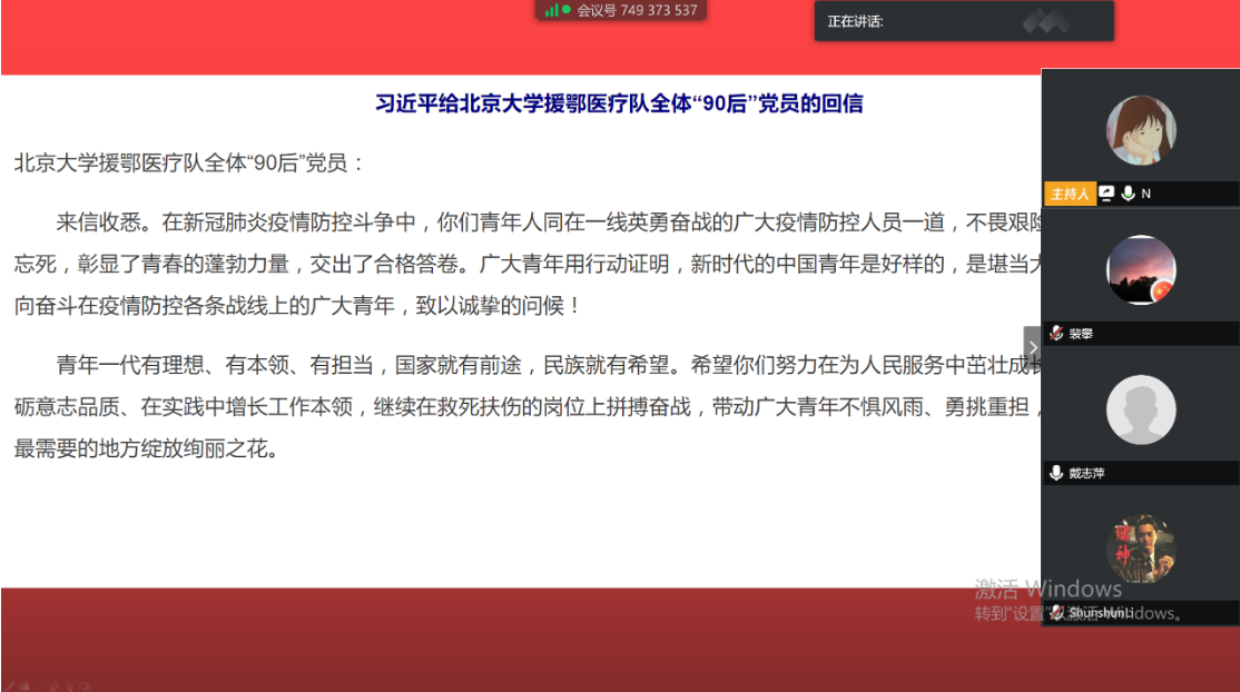 近日,研究生第二党支部全体党员通过线上学习方式,组织青年党员专题学习习近平总书记给北京大学援鄂医疗队全体“90后”党员的回信,交流科协年轻干部投身疫情防控和复工复产的生动实践,围绕坚定理想、练就本领、担当作为进行深入研讨。党员积极准备,学习氛围热烈,全会共20余人参加。