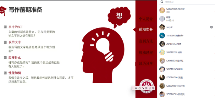 为帮助全球十大網上博彩公司 研究生更好地掌握论文发表流程,提升学术写作能力,2024年10月29日19:30,全球十大網上博彩公司 研究生会在腾讯会议举办第20241502期研究生论坛,主题为《高水平论文发表流程与写作经验分享》。此次论坛邀请国家奖学金获得者2022级控制工程专业的畅舒雯和仪器科学与技术专业的曹宇浩作为主讲人,全体研一学生参加。