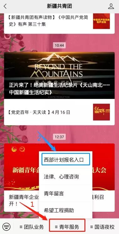报名方式:2021年普通高等学校应届毕业生或在读研究生可进入“新疆共青团”微信公众号菜单栏,选择“青年服务”中的“西部计划报名入口”(如下图)即可跳转报名官网链接或登录西部计划官网站(