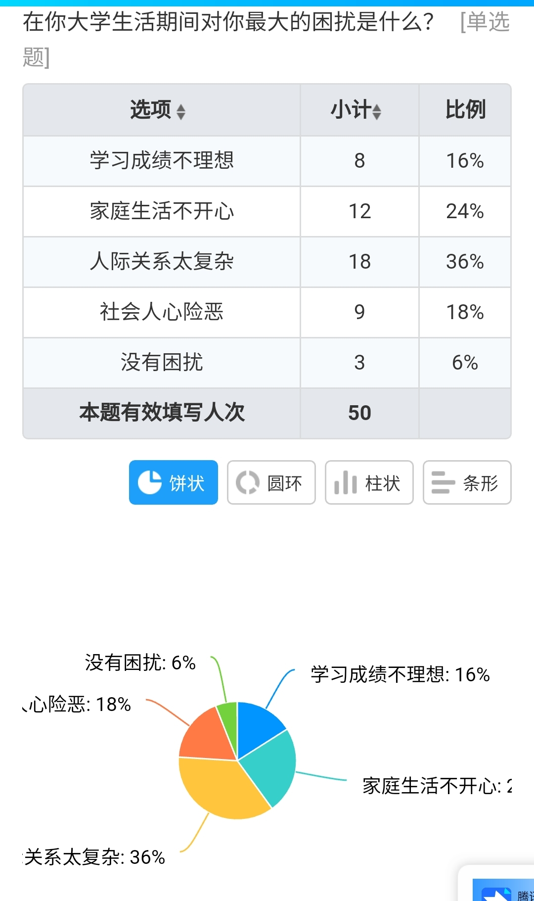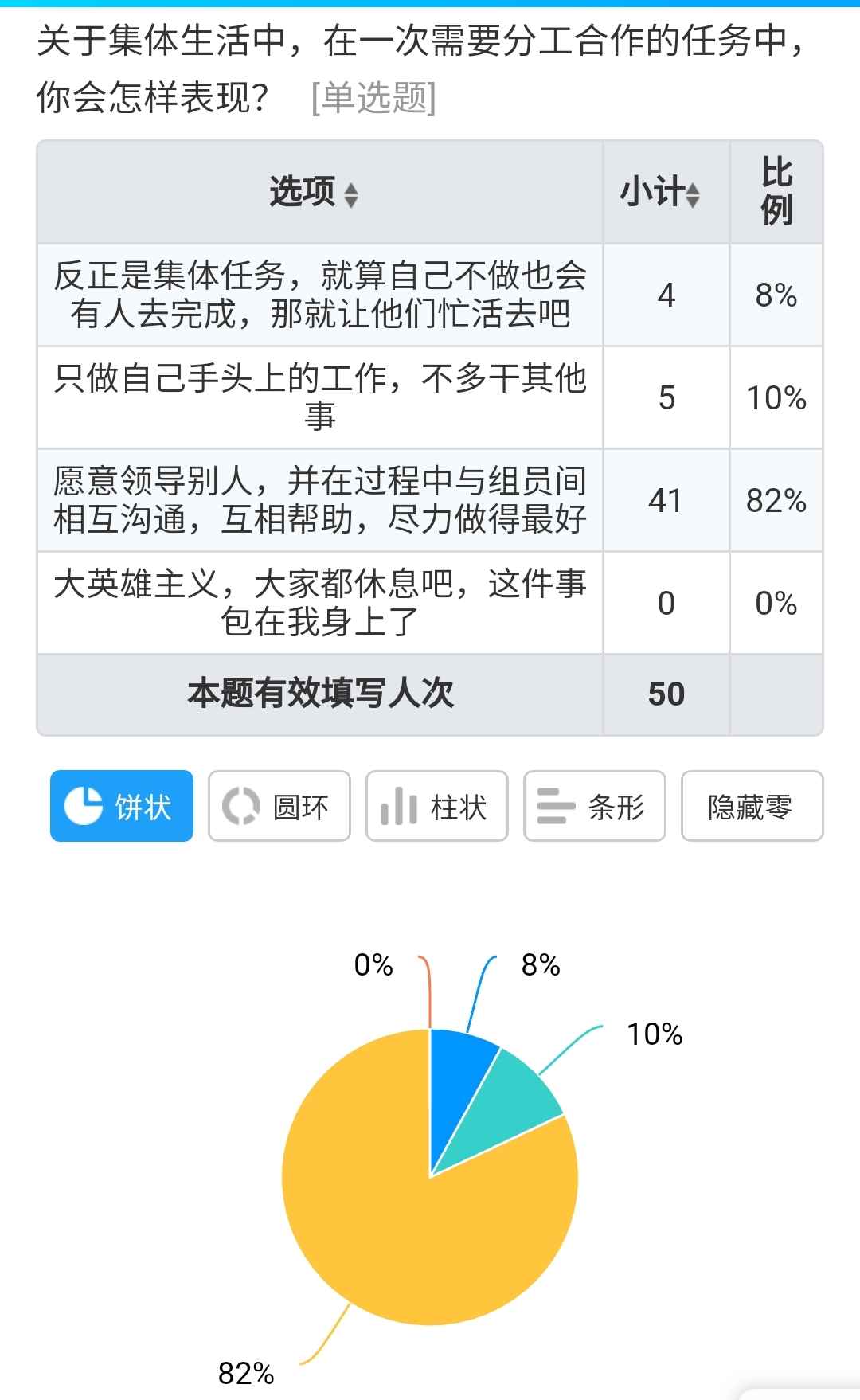 其中,在关于“在你大学生活期间对你最大的困扰是什么”的问题中,选择“人际关系太复杂”的占36%、“家庭生活不开心”的占24%、“社会人心险恶”的占18%、“学习成绩不理想”的占16%,剩下6%的选择“没有困扰”。在关于“关于集体生活中,在一次需要分工合作的任务中,你会怎样表现”的问题中,选择“愿意领导别人,并在过程中与组员间相互沟通,互相帮助,尽力做得更好”的占82%、“只做自己手头的,不多做”的占10%、“完全让别人做”的占8%、“大英雄主义,独揽全部”的占0%。
