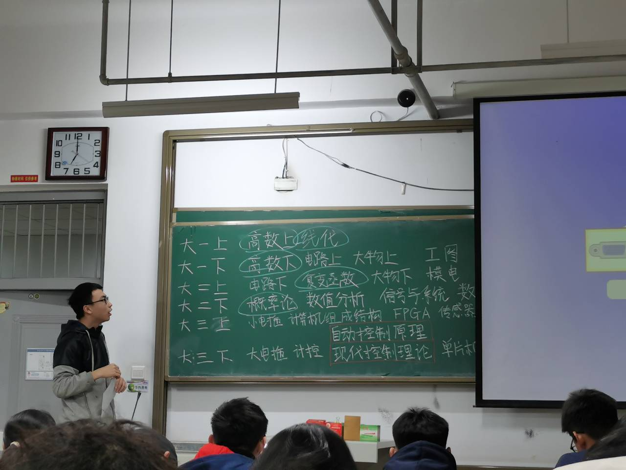 首先,亢早艺学长列出大学四年自动化专业的课程安排,并进行分类讲解和如何进行学习规划,强调了有目标学习的重要性,在此期间,同学们还相互传阅了学长的高数笔记,大家受益匪浅。紧接着亢早艺学长对同学们提出的就业问题进行讲解,同时提到了各种编程语言的学习。之后,学长还向我们介绍了各项大学期间可以参加的竞赛。最后分享了自己的保研经验和考研可以选择的有价值的学校。在整个讲座期间,同学们积极配合并向学长提出自己在初次步入大学生活的各种问题,亢早艺学长也耐心的回答同学们的问题。