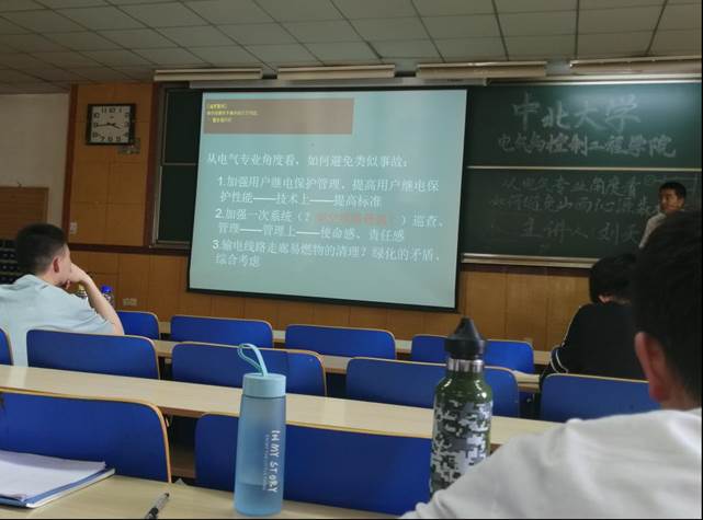 论坛伊始,全体起立为在山西沁源山林火灾中牺牲的消防队员们默哀一分钟。随后,刘天野老师从山西沁源“3·29”森林火灾事件出发,为我们介绍继电保护系统的概念,并从电力系统继电保护的基本功能、基本原理进行理论讲解。同时,他还从电气专业的角度详细地分析山西沁源山林火灾起火的原因,并介绍安全用电的注意事项。最后,他还对我们提出了几点要求:学好专业知识,在技术上提高标准;增强责任意识,在管理上要把安全放到首位。