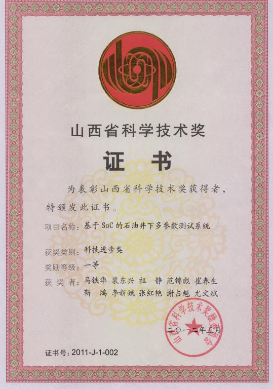 2012年“基于SoC的石油井下多参数测试系统”获得山西省科技进步一等奖,省级鉴定为国际领先水平。成果完成人:马铁华、裴东兴、祖静、范锦彪、崔春生、靳鸿、李新娥、张红艳、谢占魁、尤文斌。