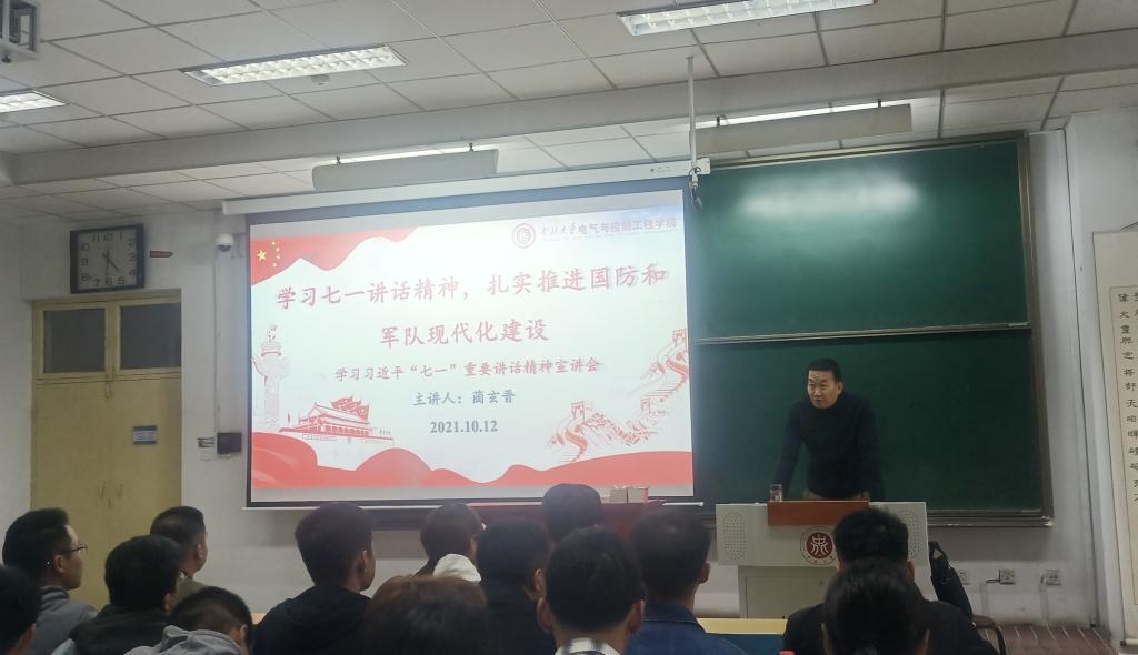 党委在11512H教室举行了学习贯彻习近平总书记“七一”重要讲话精神专题宣讲会,大会邀请到我校党史学习教育理论宣讲团成员蔺玄晋老师作了题为《学习七一讲话精神,扎实推进国防和军队现代化建设》的专题宣讲。会议由学院党委书记陈晔主持,全院师生党员及入党积极分子参加了会议。